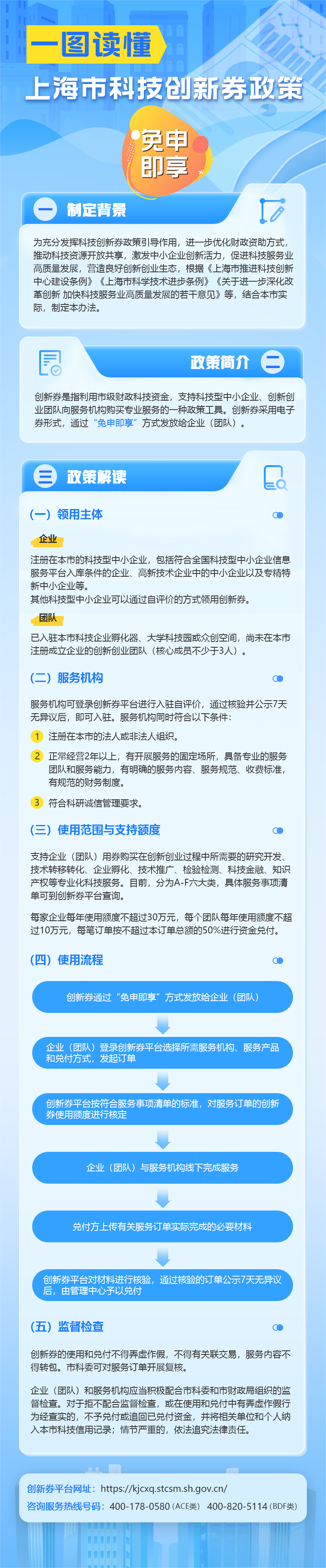 为充分发挥科技创新券政策引导作用,进一步优化财政资助方式,推动科技资源开放共享,激发中小企业创新活力,促进科技服务业高质量发展,营造良好创新创业生态,市科委会同市财政局修订形成了《上海市科技创新券管理办法》(沪科规〔2025〕6号,以下简称《管理办法》)。